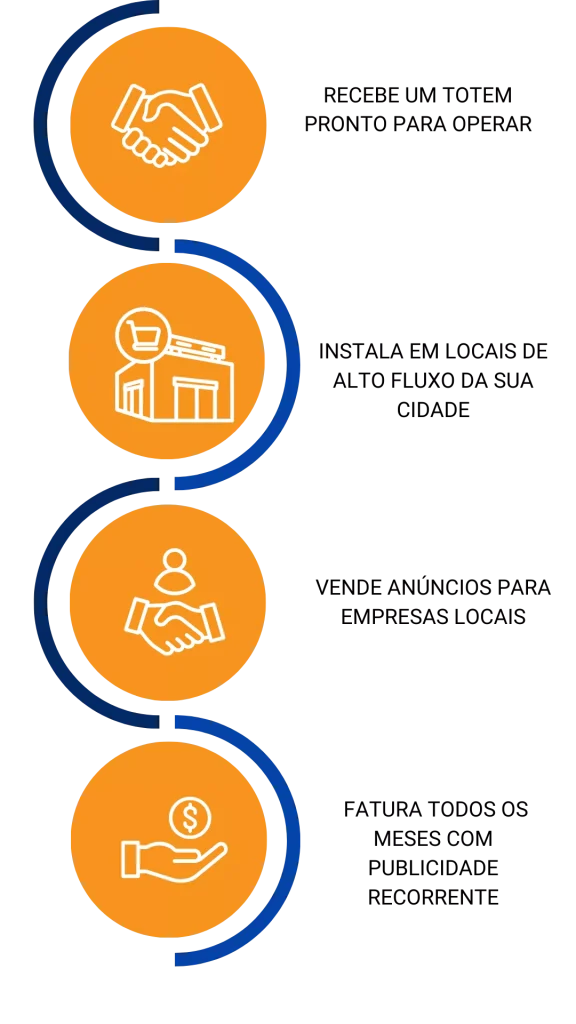 Você vende espaços publicitários para empresas locais com contratos mensais ou anuais, gerando receita recorrente, previsível e com alto potencial de fidelização.