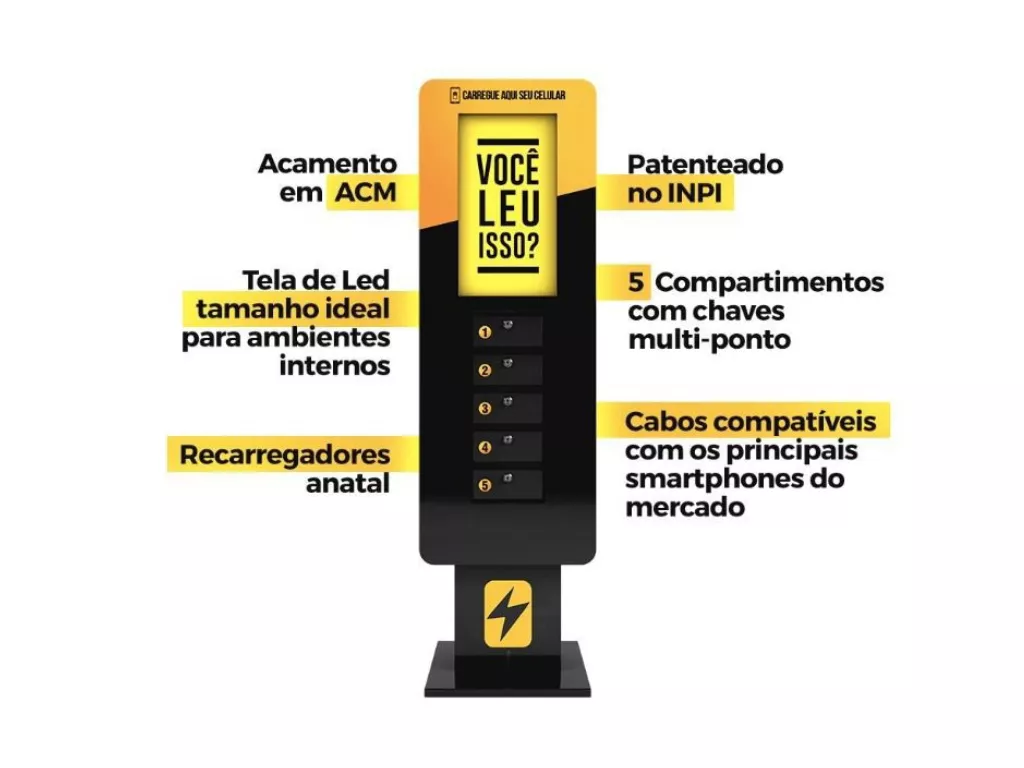 Equipado com 6 compartimentos de carga com chave individual, cabos certificados e sistema seguro. O público carrega o celular com conforto e segurança enquanto é impactado pelos anúncios.