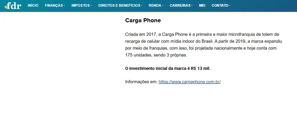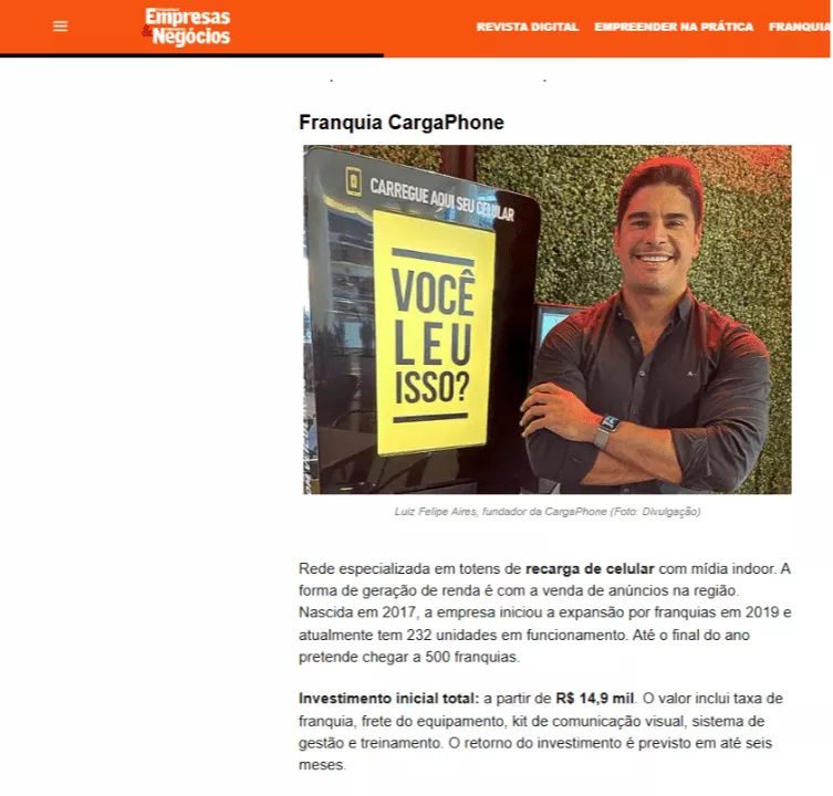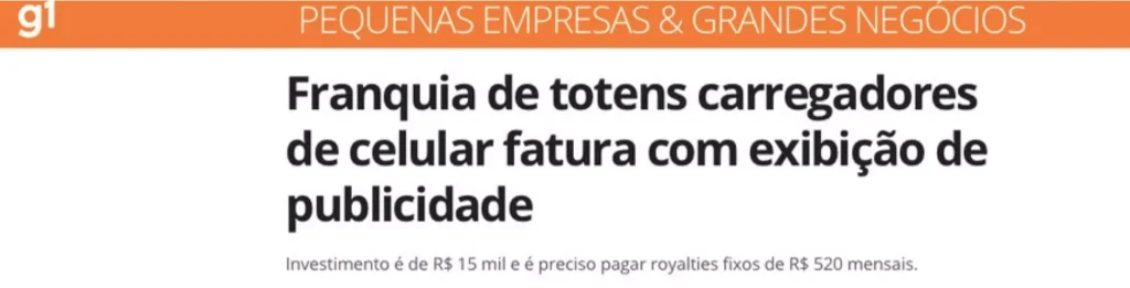 Conheça a CargaPhone, a primeira franquia de publicidade em totens carregadores de celular , um modelo inovador, descomplicado e validado por mais de 500 franqueados no Brasil.